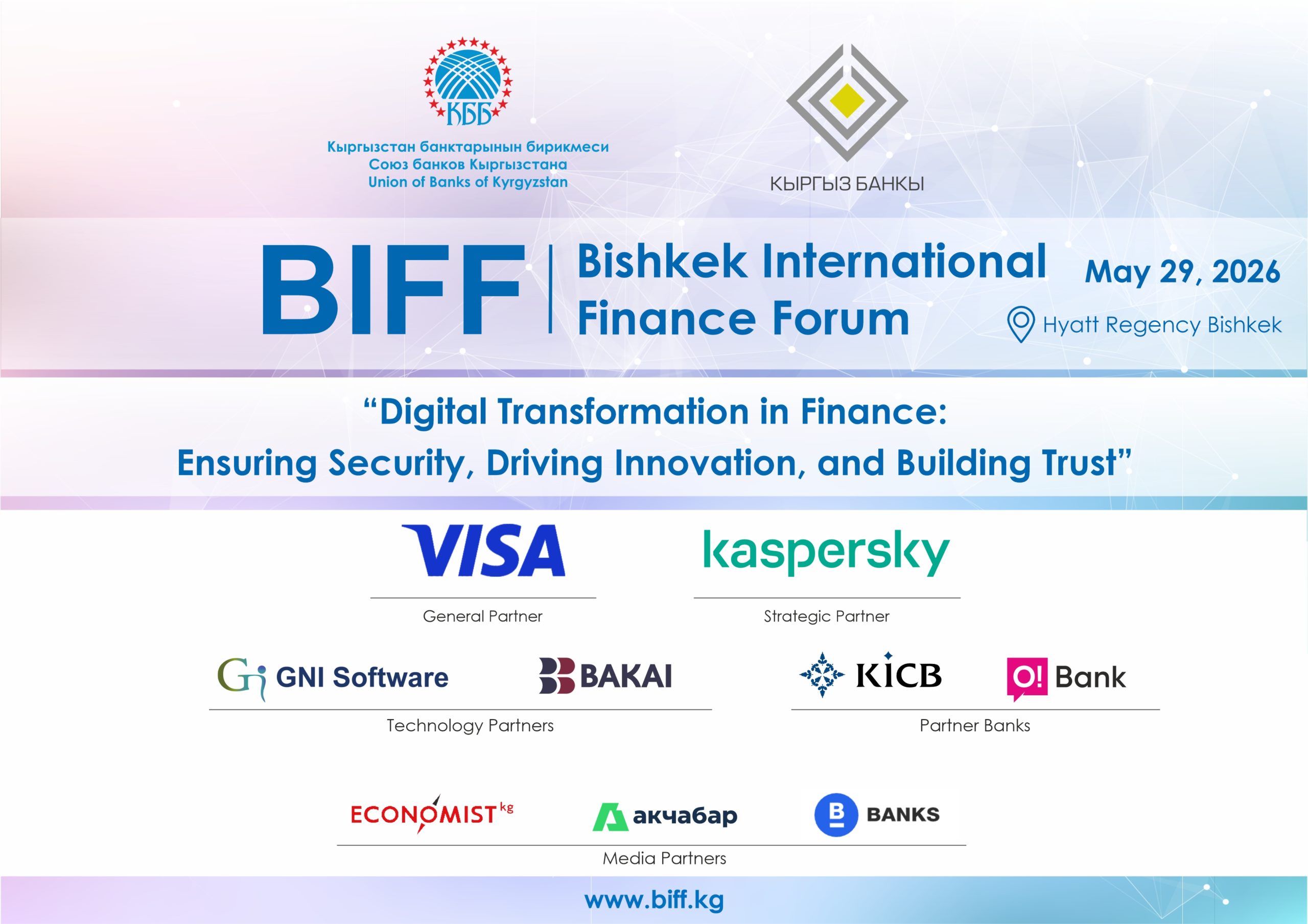 29 мая 2026 года в отеле Hyatt Regency Bishkek (г. Бишкек, Кыргызская Республика) состоится Бишкекский Международный Финансовый Форум — BIFF2026, организуемый ОЮЛ «Союз банков Кыргызстана» при соорганизации Национального банка Кыргызской Республики.