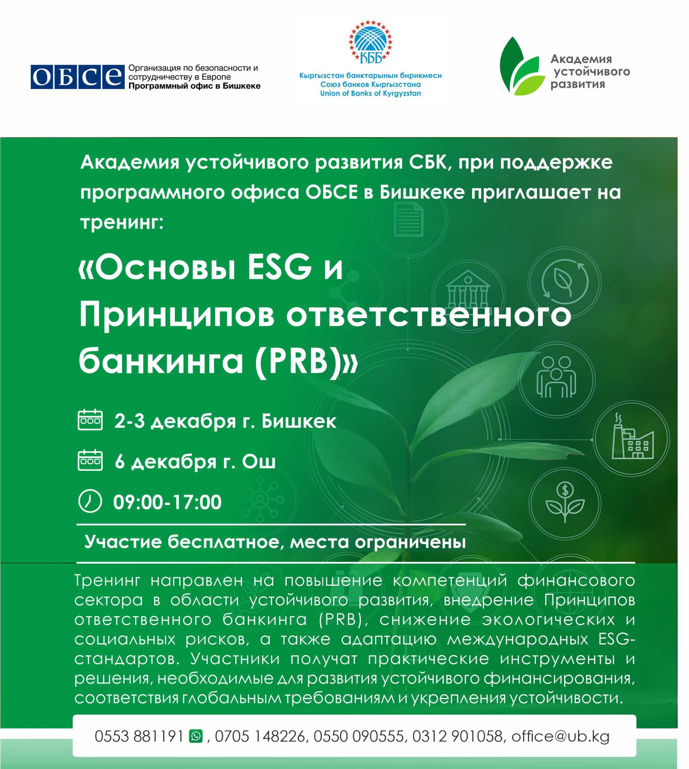 Академия устойчивого развития Союза банков Кыргызстана, при поддержке программного офиса ОБСЕ в Бишкеке, в рамках проекта «Повышение потенциала и осведомленности финансового сектора в вопросах климатической повестки», приглашает представителей финансовых институтов, регуляторов и общественных организаций принять участие в тренингах по вопросам ESG (экологическое, социальное и корпоративное управление), а также Принципов ответственного банкинга (PRB), что играет важную роль в достижении устойчивого развития.
